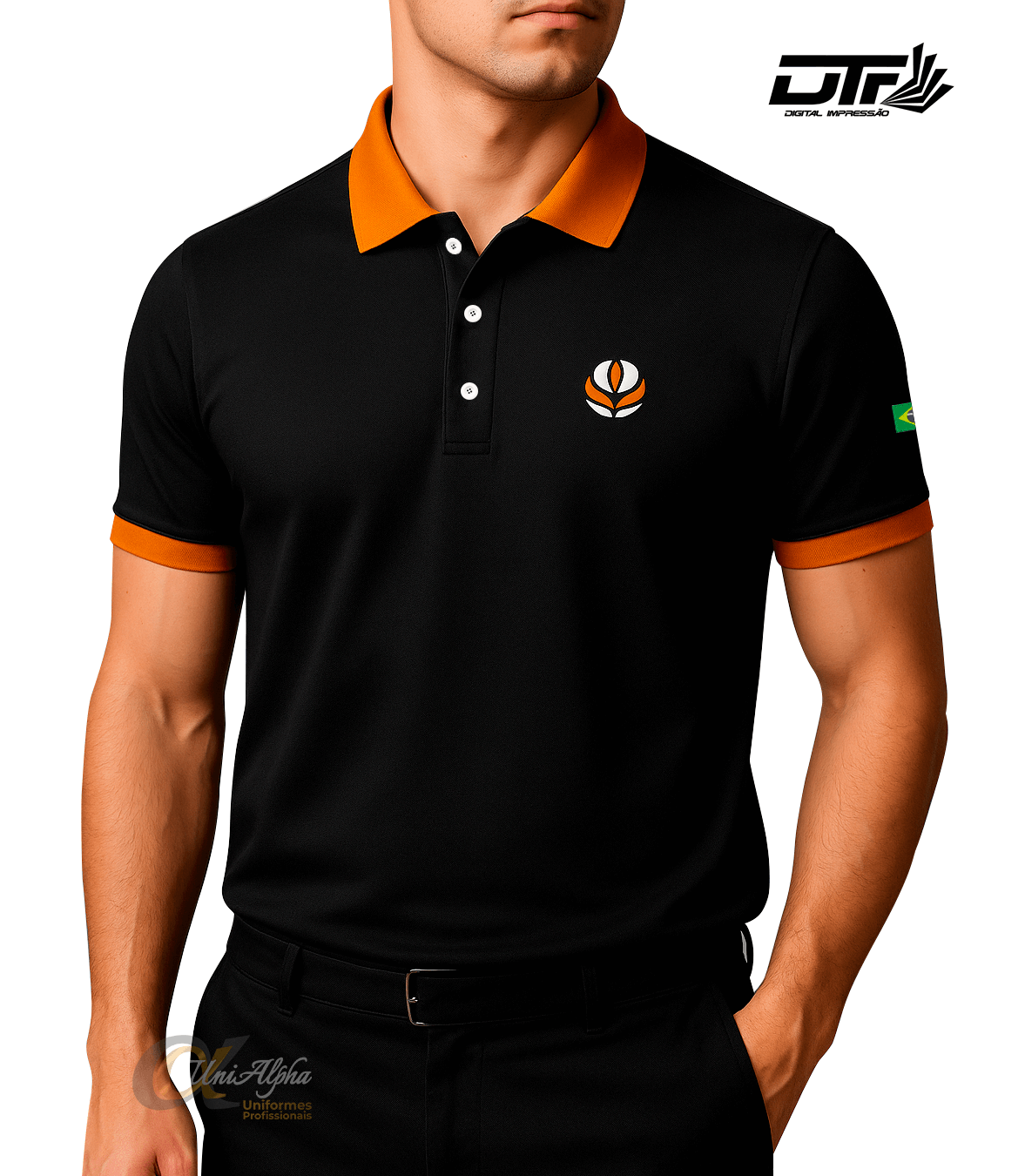 Na Unialpha Uniformes, produzimos camisas polo sob medida para empresas, com logo bordado ou impressão digital DTF de alta definição, na frente e também nas costas (com valor adicional).