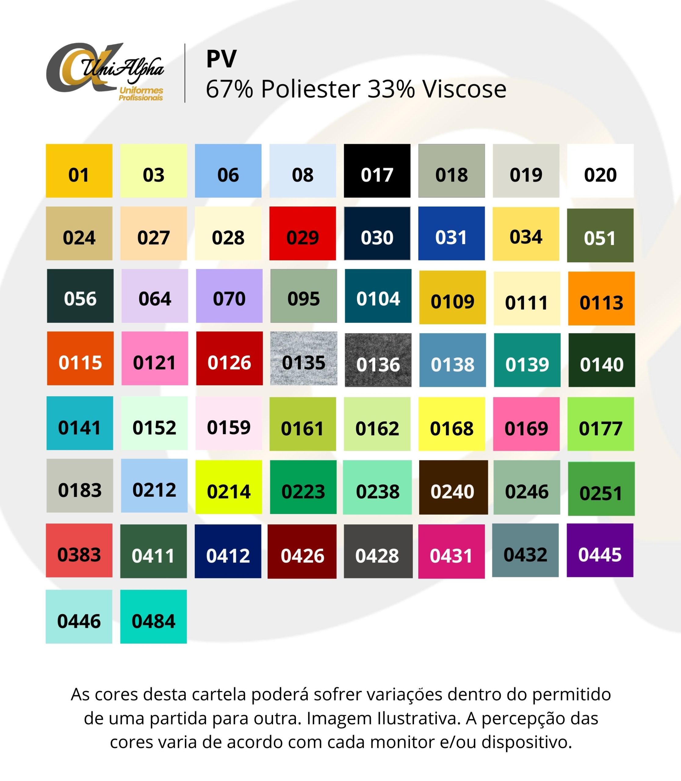 A malha PV (fria) é ideal para climas quentes, pois não amassa e garante conforto no uso diário.